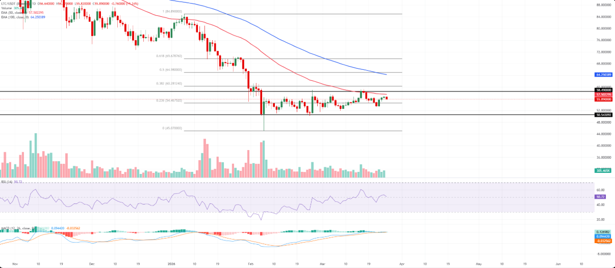 Tại thời điểm viết bài, Litecoin giao dịch dưới ngưỡng 58 USD, với xu hướng ngắn hạn nghiêng nhẹ về giảm sau khi giá bị từ chối quanh đường EMA 50 ngày tại khu vực 57,50 USD.