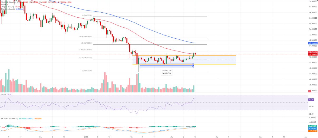 Tại thời điểm viết bài, Litecoin giao dịch quanh mốc 57 USD, với xu hướng ngắn hạn nghiêng nhẹ về phía tăng. Giá đã phục hồi từ vùng giữa 50 USD và đang áp sát biên trên của kênh giá ngắn hạn, bắt đầu quanh 57,10 USD. Việc đóng cửa nến ngày trên đường EMA 50 ngày tại khoảng 58,30 USD phần nào làm suy yếu đà giảm trước đó, dù EMA 100 ngày quanh 65,90 USD vẫn đóng vai trò là ngưỡng kháng cự đáng chú ý.