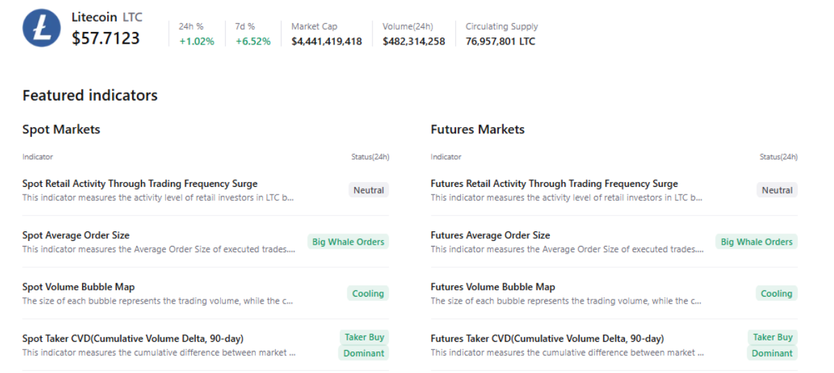 Dữ liệu tổng hợp từ CryptoQuant củng cố triển vọng tích cực cho Litecoin, khi cả thị trường giao ngay lẫn hợp đồng tương lai đều ghi nhận sự xuất hiện của các lệnh quy mô lớn từ cá voi. Trong bối cảnh điều kiện thị trường hạ nhiệt và lực mua dần chiếm ưu thế, đây thường là những tín hiệu ủng hộ khả năng tăng giá.