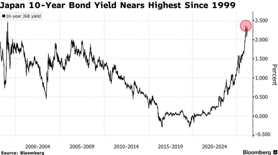 Lợi suất trái phiếu chính phủ Nhật Bản kỳ hạn 10 năm đã tăng lên 2,30%, mức cao nhất kể từ năm 1999 và vượt đỉnh của cuộc khủng hoảng tài chính 2008 khoảng 30 điểm cơ bản. Đà tăng này phản ánh áp lực ngày càng lớn lên thị trường trái phiếu trong bối cảnh kỳ vọng Ngân hàng Trung ương Nhật Bản sẽ bình thường hóa chính sách tiền tệ.