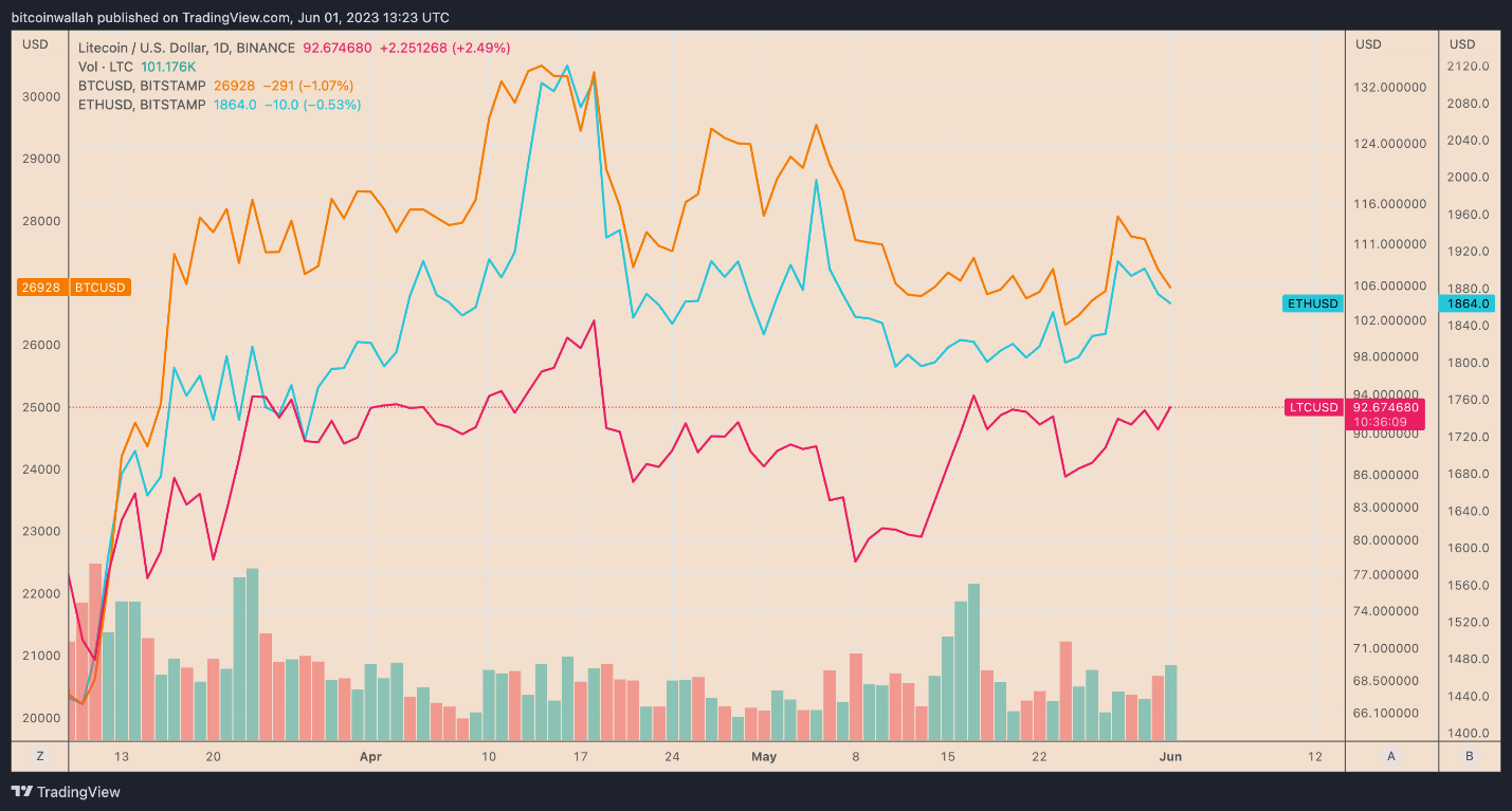 Biểu đồ giá hàng ngày của LTC so với BTC và ETH | Nguồn: TradingView