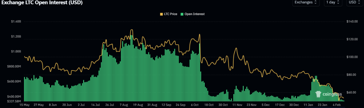 Trên thị trường phái sinh, bức tranh cũng chưa mấy sáng sủa khi hợp đồng mở (OI) của Litecoin tiếp tục suy yếu, lùi về quanh mốc 350 triệu USD, trong khi tỷ lệ funding rate duy trì ở vùng tiêu cực. Hợp đồng mở phản ánh tổng giá trị các hợp đồng phái sinh đang lưu hành, còn funding rate là khoản thanh toán định kỳ giữa các trader nhằm giữ giá hợp đồng vĩnh cửu bám sát với thị trường giao ngay.