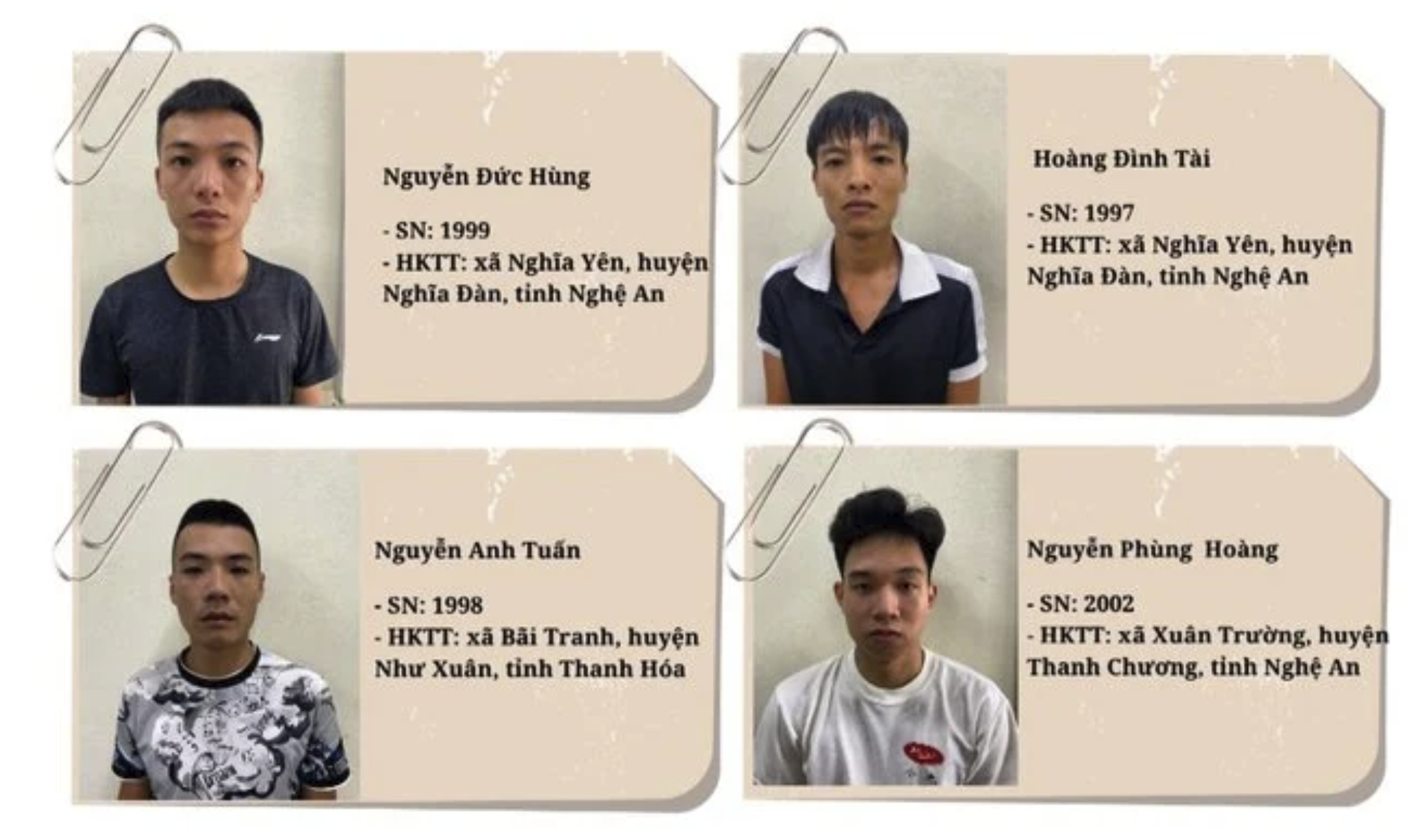 Qua điều tra, công an xác định thêm ba kẻ cùng thực hiện hành vi với Hùng là Hoàng Đình Tài (27 tuổi, ở huyện Nghĩa Đàn, Nghệ An), Nguyễn Phùng Hoàng (22 tuổi, trú tại huyện Thanh Chương, tỉnh Nghệ An) và Nguyễn Anh Tuấn (26 tuổi, trú tại huyện Như Xuân, tỉnh Thanh Hóa).