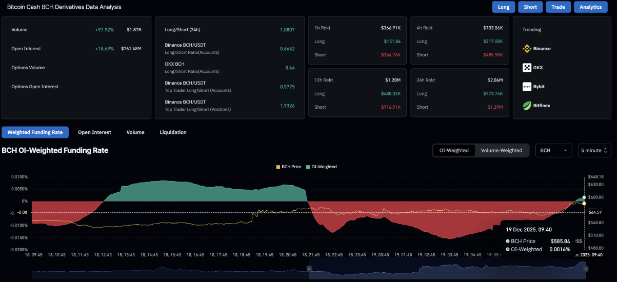 Theo dữ liệu từ CoinGlass, hợp đồng mở (OI) trên thị trường hợp đồng tương lai BCH đã tăng 18,69% trong vòng 24 giờ, lên mức 761,48 triệu USD. Diễn biến này cho thấy dòng tiền đang quay trở lại thị trường trong bối cảnh khẩu vị rủi ro được cải thiện. Đáng chú ý, tỷ lệ funding rate đã đảo chiều sang mức dương 0,0016%, từ -0,154% trước đó trong ngày, qua đó xác nhận lực mua mới đang được kích hoạt và củng cố xu hướng tăng ngắn hạn của BCH.