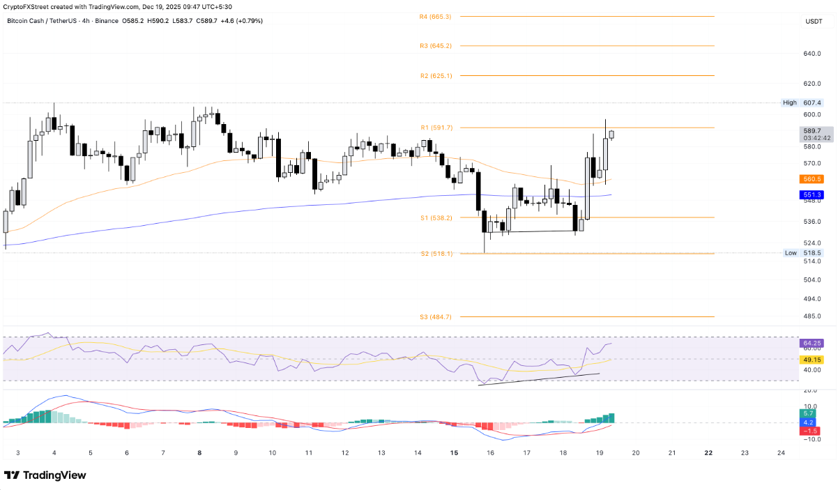 Bitcoin Cash (BCH) hiện đang giao dịch vững chắc phía trên cả hai đường trung bình động hàm mũ (EMA) 50 và EMA 200 trên khung thời gian 4 giờ, sau khi hoàn tất mô hình hai đáy hình thành quanh vùng hỗ trợ 530 USD. Động lực tăng giá đang được củng cố khi BCH tiến sát điểm Pivot R1 tại 591 USD, với kỳ vọng thiết lập một phiên đóng cửa tích cực phía trên ngưỡng kháng cự quan trọng này.