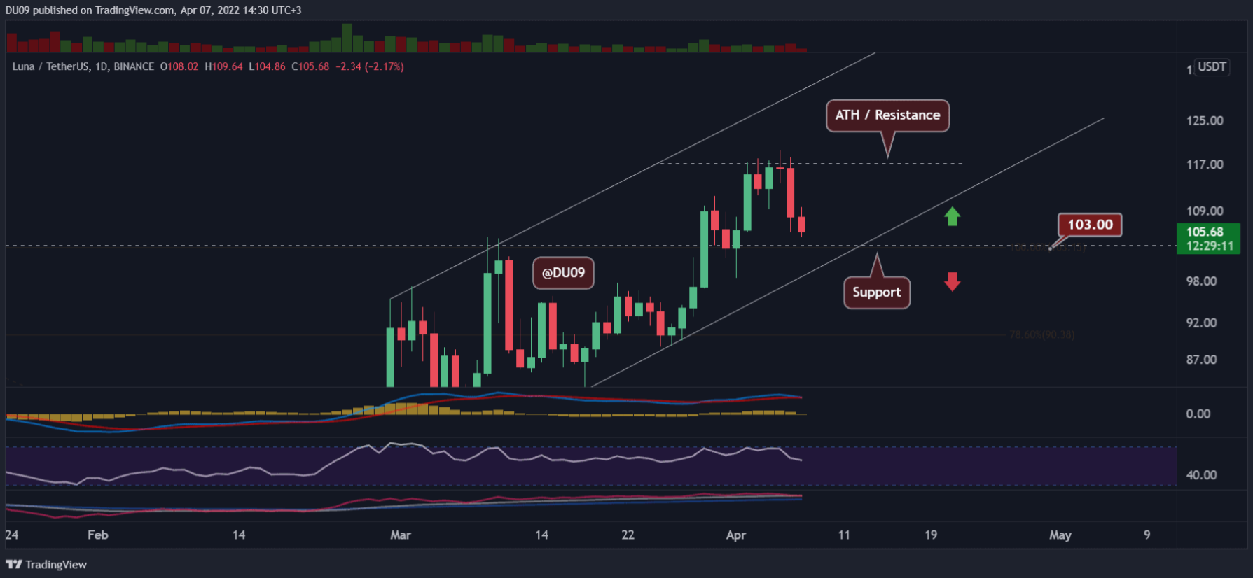 Sau một cuộc biểu tình ấn tượng, LUNA đã quản lý để thiết lập mức cao nhất mọi thời đại mới ở $ 119,55. Giá hiện đang bị ràng buộc bên trong một đợt điều chỉnh sau khi phe gấu chiếm lĩnh thị trường vào ngày hôm qua. Điều này đã biến $ 120 thành kháng cự và mức hỗ trợ quan trọng gần nhất được tìm thấy ở $ 103 và sau đó là $ 90.