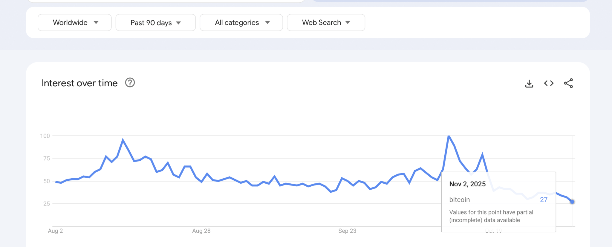 Trên thang điểm 0–100 của Google Trends — trong đó 100 đại diện cho mức độ quan tâm cao nhất trong giai đoạn và khu vực được chọn — mức tìm kiếm “bitcoin” toàn cầu đã tăng từ khoảng 50 điểm đầu tháng 10 lên đỉnh 100 vào ngày 11/10, rồi giảm dần xuống vùng 30 điểm vào cuối tháng. Đồ thị thể hiện một đợt bùng nổ ngắn giữa tháng, tiếp đó là giai đoạn hạ nhiệt rõ rệt.