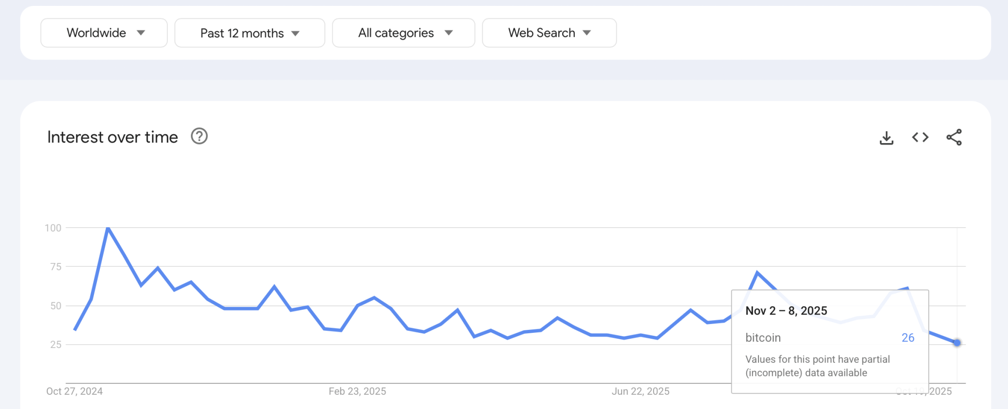Ở khung 12 tháng, Google Trends cho thấy một đỉnh sớm quanh mức 100, sau đó là giai đoạn trầm lắng kéo dài giữa năm, chủ yếu quanh vùng 30–40 điểm, và một cú bật lại vào cuối tháng 10 nhưng không duy trì được lâu. Tuần gần nhất (2–8.11) ghi nhận mức 26, cũng được đánh dấu là “tạm thời”.