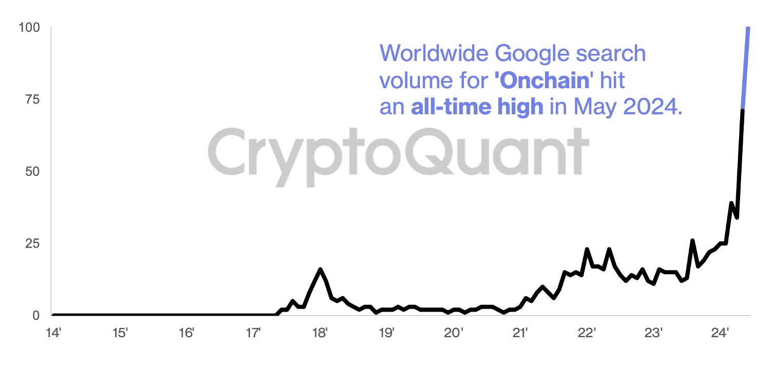 Tuy nhiên, từ ngày 26 tháng 5 đến ngày 1 tháng 6, mối quan tâm tìm kiếm “onchain” đã đạt chỉ số trên 100.