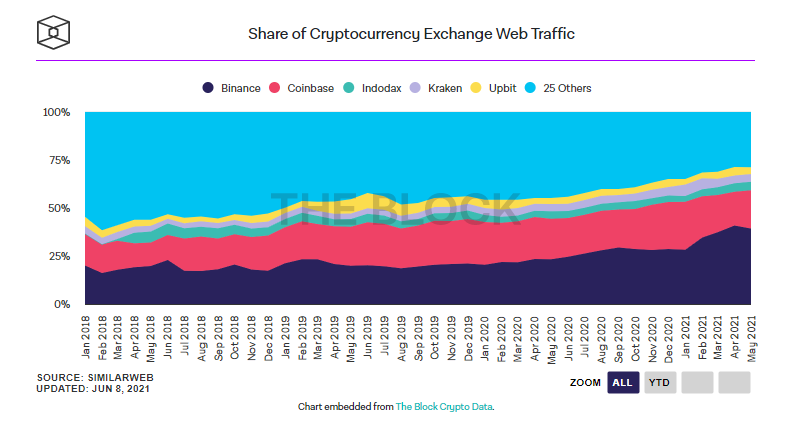 Sàn giao dịch tiền điện tử nhận được nhiều lượt truy cập nhất trong tháng 5 là Binance, chiếm tới 39,4% tổng lưu lượng truy cập, tiếp theo là Coinbase với 19,1%.