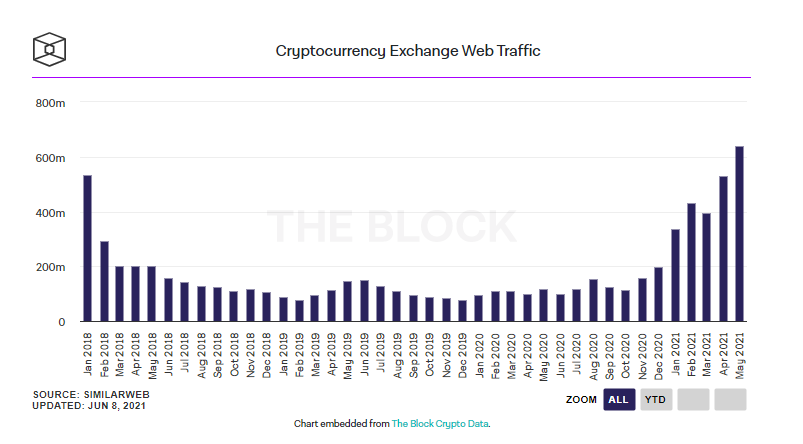 Lưu lượng truy cập vào các sàn giao dịch tiền điện tử đã tăng 20,4% trong tháng 5 so với con số của tháng 4. Lưu lượng truy cập sàn giao dịch tiền điện tử là 638,2 triệu vào tháng 5, nghĩa là cao hơn 108 triệu lượt truy cập so với mức cao nhất mọi thời đại gần đây nhất xảy ra vào tháng 1 năm 2018, với 531,7 triệu lượt truy cập.