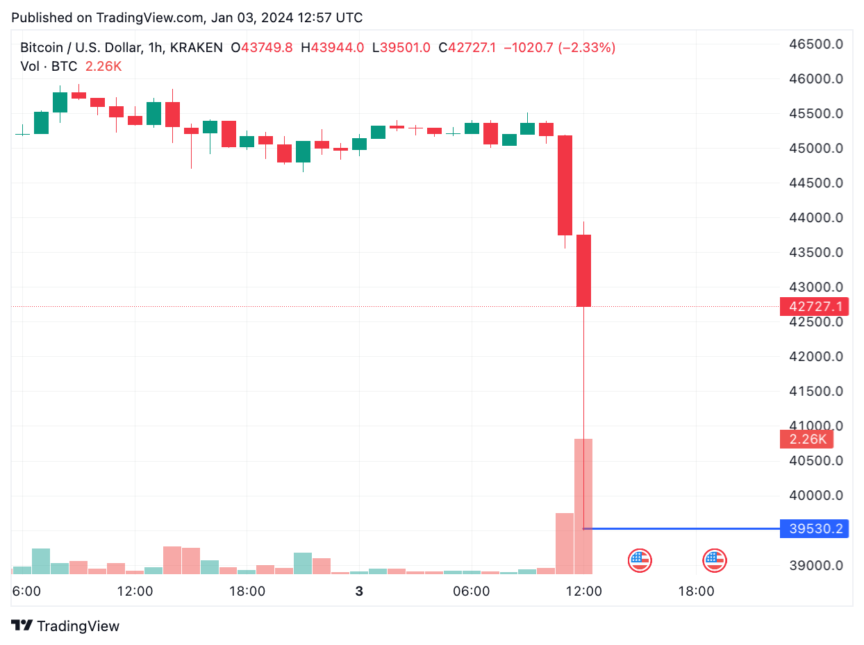 Sau dự đoán của Thielen, giá BTC đã lao nhanh xuống dưới 40.000 USD và hiện giảm 7%, giao dịch ở mức 42.317 USD trong 24 giờ qua.