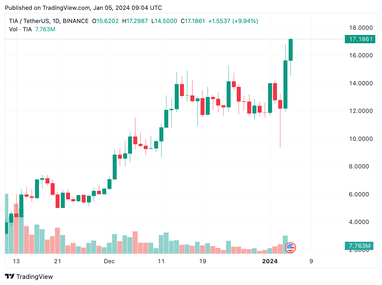 TIA giao dịch ở mức 17,18 USD vào thời điểm viết bài, cũng là ATH mới của token này, với khối lượng giao dịch gần 864 triệu USD trong 24 giờ qua.