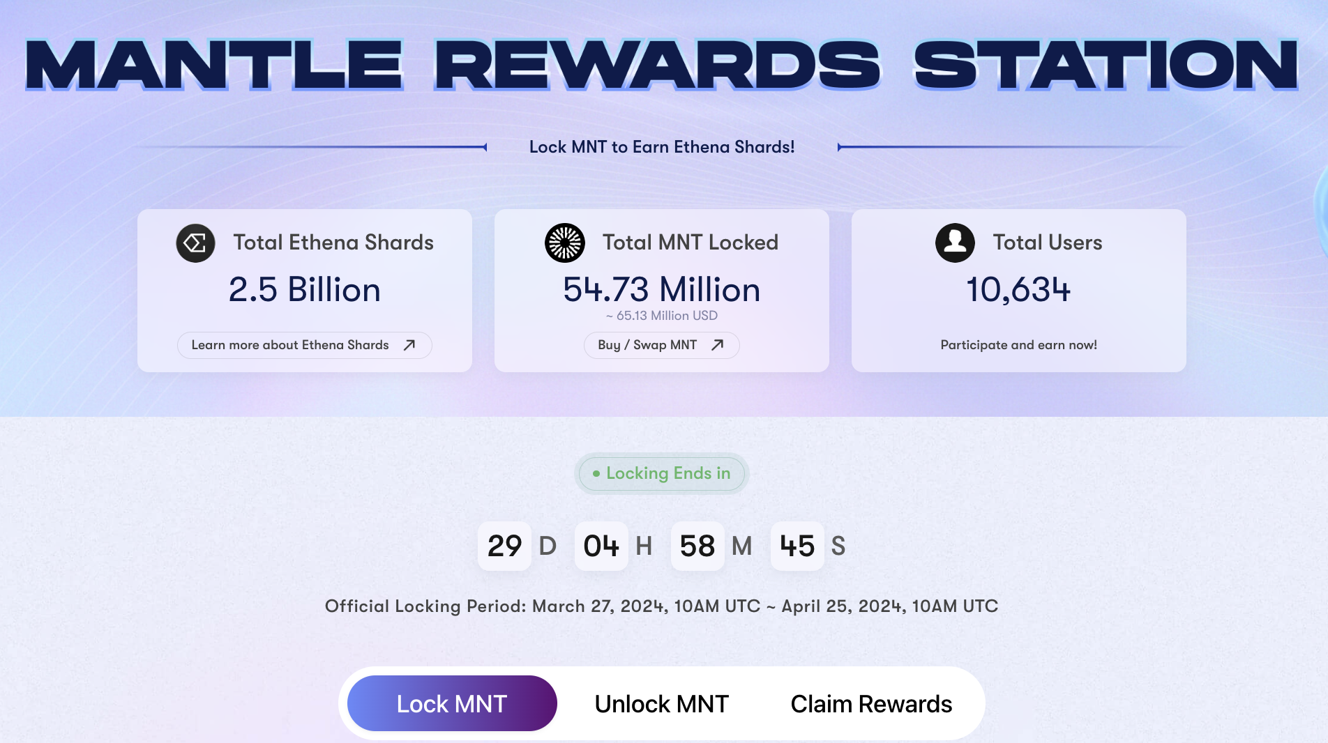 Phần thưởng được hỗ trợ hoàn toàn bởi Kho bạc của Mantle, được phân phối dưới dạng token ‘mShard’. Staker MNT sẽ có thể claim mShard hàng ngày trong thời gian khóa (kết thúc vào ngày 25 tháng 4) bằng cách đổi lấy token gốc ENA của Ethena Labs. Hiện tại có 2,5 tỷ Ethena Shard ước tính trị giá 1,8 triệu USD.