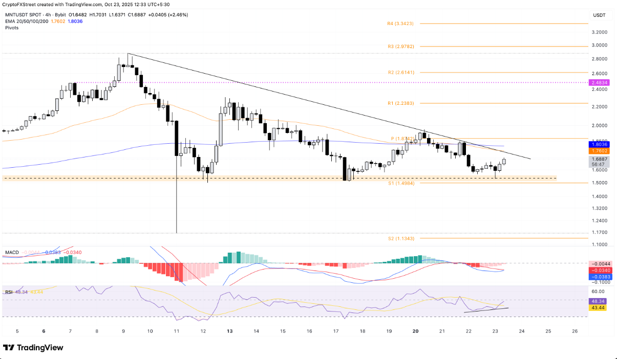 Tính đến thời điểm viết bài, giá MNT đã phục hồi hơn 5% sau ba phiên giảm liên tiếp, bật lên mạnh mẽ từ vùng hỗ trợ tâm lý 1,50 USD và hiện đang tiến sát đường kháng cự ngắn hạn – được xác lập bằng cách nối hai đỉnh ngày 9/10 và 21/10 trên khung 4 giờ.