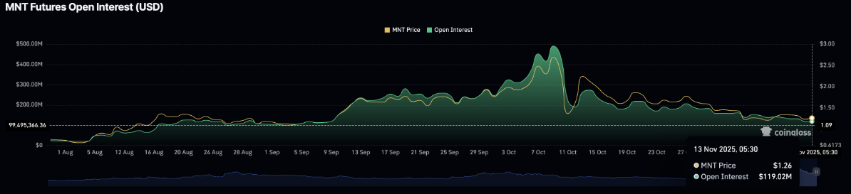Mantle đang đối mặt với thách thức trong việc duy trì sức hút từ các trader phái sinh, khi làn sóng biến động tăng cao trên thị trường tiền điện tử lan tỏa tâm lý thận trọng. Theo dữ liệu từ CoinGlass, hợp đồng mở (OI) — chỉ số phản ánh tổng giá trị danh nghĩa của các hợp đồng tương lai đang mở — của MNT đã giảm mạnh sau cú sụp đổ vào ngày 10/10, cho thấy niềm tin của các trader vào khả năng hồi phục ngắn hạn của Mantle đang yếu đi.