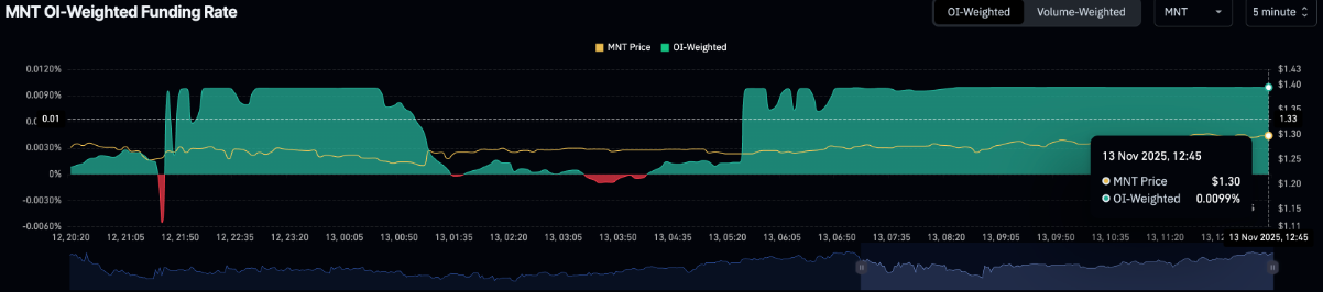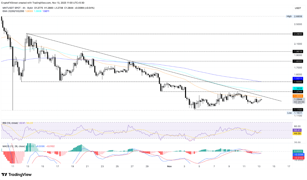 Đà hồi phục ngắn hạn của Mantle (MNT) đang dần tạo sức bật, mặc dù sự tham gia của nhà đầu tư bán lẻ vẫn còn hạn chế. Giá đang tiến gần đến đường kháng cự quan trọng trên khung 4 giờ, được hình thành từ việc nối các đỉnh ngày 12 và 27/10 quanh mốc 1,3200 USD. Hiện MNT vẫn giao dịch dưới các đường trung bình động hàm mũ (EMA) 50, 100 và 200 kỳ, với tất cả duy trì độ dốc đi xuống, phản ánh xu hướng giảm dài hạn vẫn đang chiếm ưu thế.