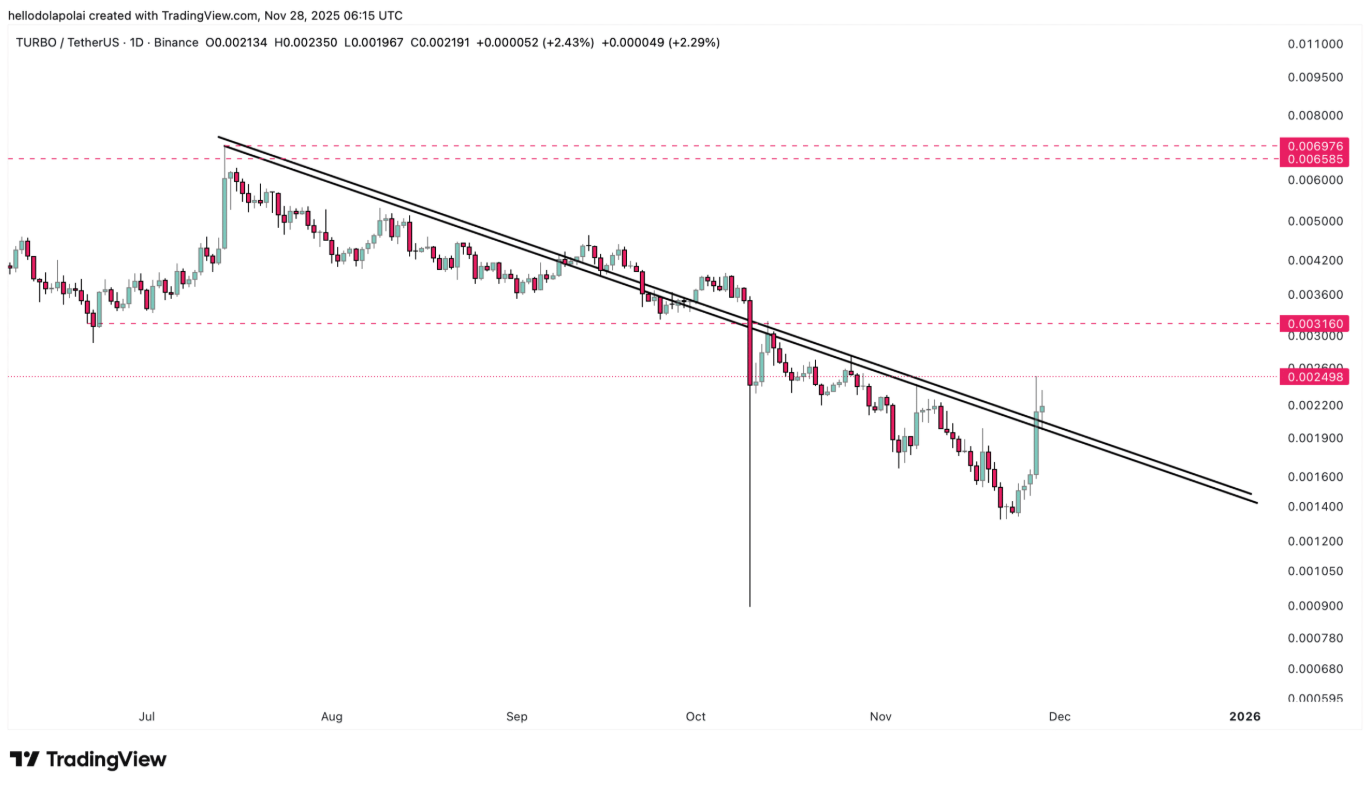 Hiện tại, tài sản đang đóng cửa quanh ngưỡng 0,002498 USD — mức từng khiến nó chững lại trong các lần thử phá trước đó — và đang giao dịch ngay dưới vùng này. Các mức kháng cự tiếp theo lần lượt ở 0,003160 USD và 0,004521 USD. Nếu Turbo thành công vượt qua các áp lực giảm này, đà tăng hoàn toàn có thể dẫn dắt giá hướng tới đỉnh cục bộ 0,006976 USD, tương đương tổng mức tăng khoảng 180% so với ngưỡng kháng cự đầu tiên.