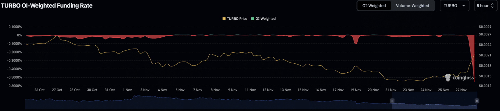 Dữ liệu từ OI–Weighted Funding Rate, thước đo phản ánh vị thế chiếm ưu thế trên thị trường phái sinh, lại cho thấy các trader đang nghiêng về xu hướng giảm. Hiện chỉ số này đã rơi xuống mức thấp nhất kể từ tháng 9 – một mốc từng gợi ý đáy ngắn hạn của TURBO trong quá khứ.