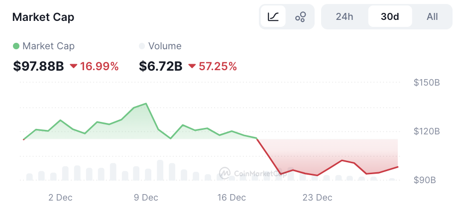 Vào ngày 1 tháng 12, tổng vốn hóa thị trường của các memecoin đạt 120,14 tỷ USD, sau đó tăng lên 137,06 tỷ USD vào ngày 9 tháng 12, nhưng đã giảm mạnh xuống chỉ còn 92,67 tỷ USD vào ngày 23 tháng 12, đánh dấu mức giảm 32,38% trong suốt tháng.