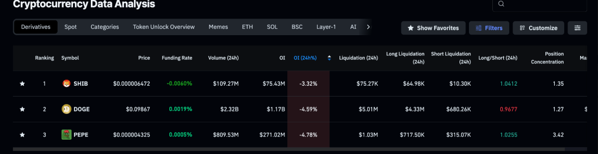 Xu hướng suy yếu không chỉ dừng lại ở Dogecoin. Hợp đồng mở của hợp đồng tương lai SHIB và PEPE lần lượt giảm xuống còn 75,43 triệu USD và 271,02 triệu USD trong cùng ngày, tương ứng mức sụt giảm hơn 3% và gần 5%, cho thấy áp lực bán đang lan rộng trên toàn bộ phân khúc meme coin.
