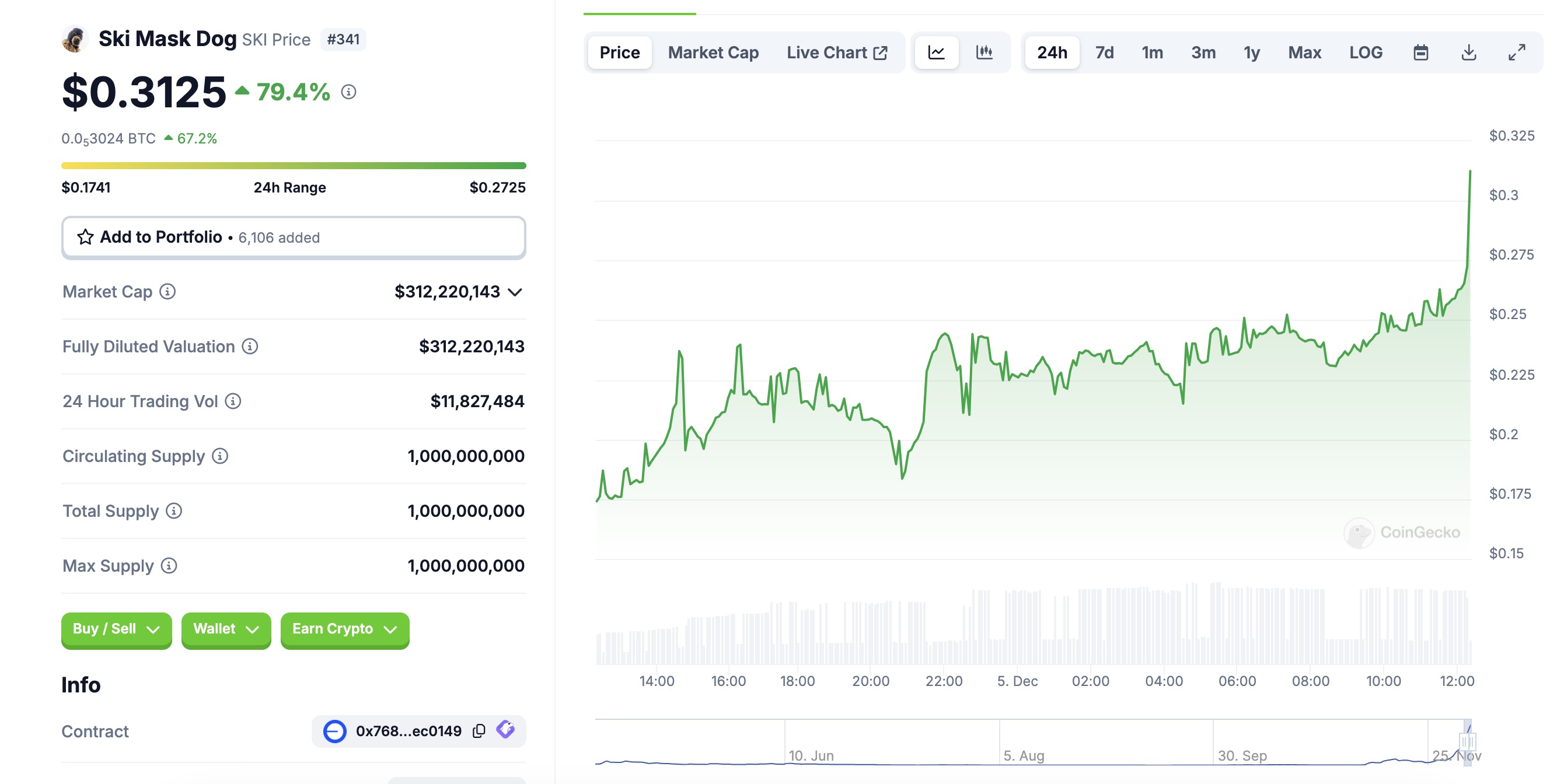 Giá của SKI đã tăng gấp 3 tới hôm nay, đạt mức cao nhất mọi thời đại là 0,3w USD. Phát hành trên mạng layer 2 Base, vốn hóa thị trường của SKI đã vượt mốc 300 triệu USD kể từ khi thông tin về giao dịch của Collins được công khai.