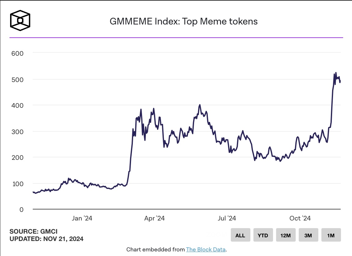 Chỉ số GMMEME, tăng 3,94%, theo dõi các memecoin chính như PEPE (tăng 11,07%), SHIB (tăng 2,92%) và DOGE (tăng 1,71%), đã tăng hơn 90% trong tháng 11. Để so sánh, các chỉ số khác như GM30 và GML1 chỉ tăng trung bình 36% trong cùng kỳ.