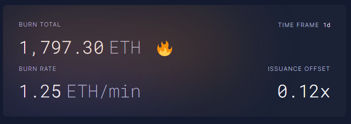 Cơ chế đốt của Ethereum có thể sẽ đảm bảo rằng nguồn cung ETH giảm. Trong 24 giờ qua, 1.797,3 ETH đã bị đốt, tương ứng với 2,99 ETH cứ mỗi 5 phút và 37.409 ETH trong 30 ngày qua.