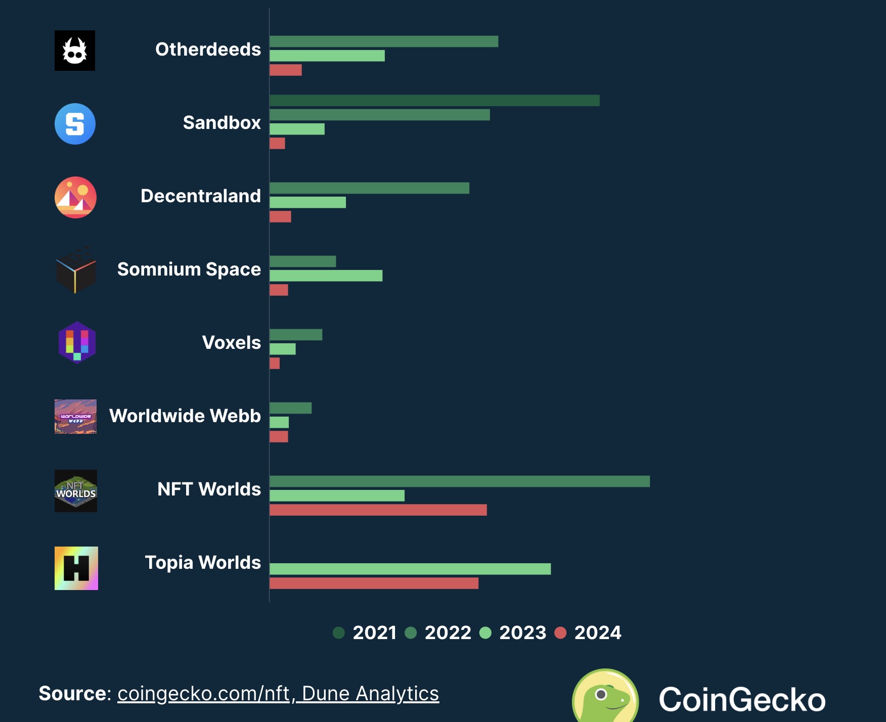 Đà lao dốc diễn ra trên toàn bộ thị trường. Một nghiên cứu của CoinGecko cho thấy đến tháng 6/2024, giá đất metaverse trung bình đã giảm 72% so với đỉnh. Trong đó, The Sandbox giảm 95%, Decentraland giảm 89%, còn Otherdeed for Otherside giảm 85% so với mức giá sàn trung bình ở chu kỳ đỉnh.