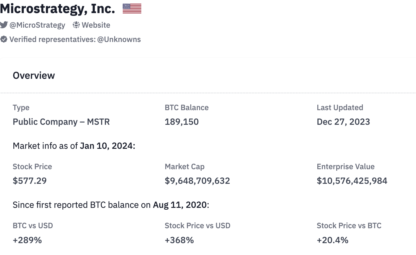 Được nạp lần cuối vào ngày 27 tháng 12 năm 2023, số coin tích trữ của công ty hiện là 189.150 BTC. Tính đến ngày 9 tháng 1, số tiền này trị giá khoảng 8,832 tỷ USD – nhiều hơn 840 triệu USD so với ngày 1 tháng 1.