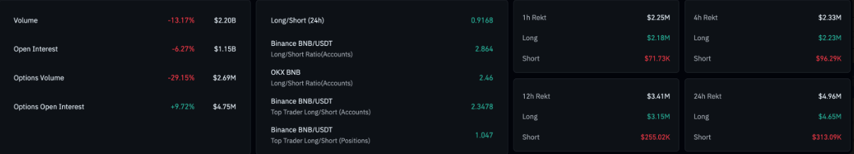 Dữ liệu từ CoinGlass cho thấy hợp đồng mở (OI) trên thị trường BNB futures đã sụt giảm hơn 6% chỉ trong vòng 24 giờ, xuống còn khoảng 1,15 tỷ USD. Diễn biến này phản ánh sự thu hẹp rõ rệt của các vị thế đang mở, đồng thời cho thấy tâm lý “risk-off” đang bao trùm thị trường.