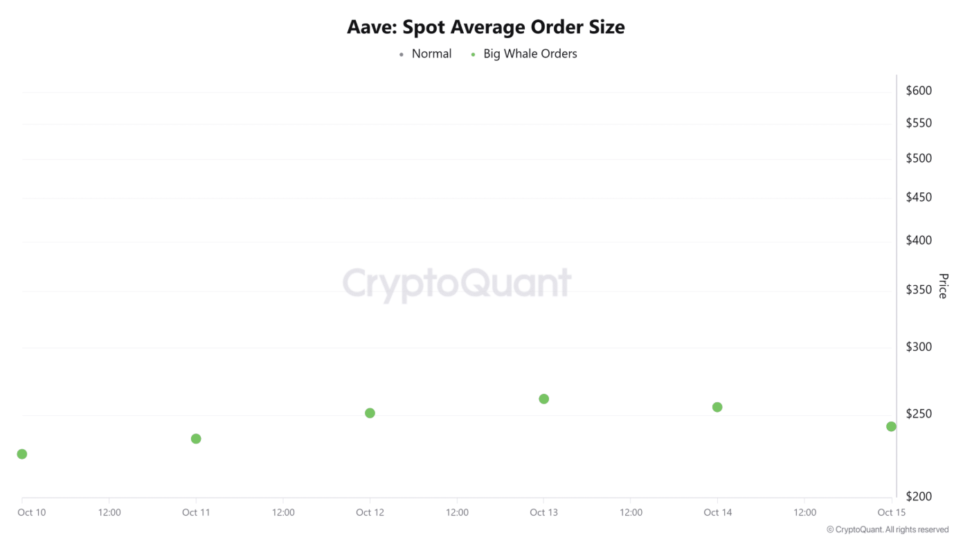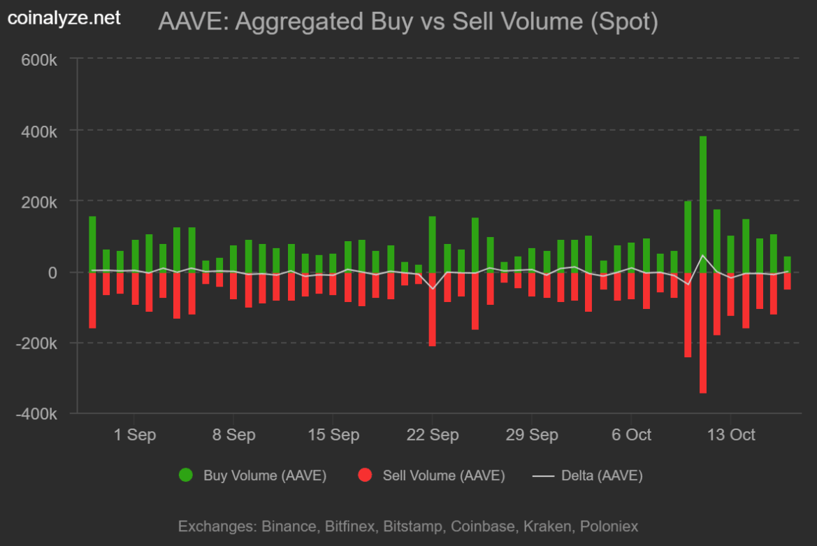 Cụ thể, vào ngày 17/10, khối lượng bán đạt tới 48.000 AAVE, trong khi khối lượng mua chỉ ở mức 46.000 AAVE, tạo ra delta âm -1,34 nghìn — dấu hiệu cho thấy lực bán đang chiếm ưu thế rõ rệt trên thị trường giao ngay.