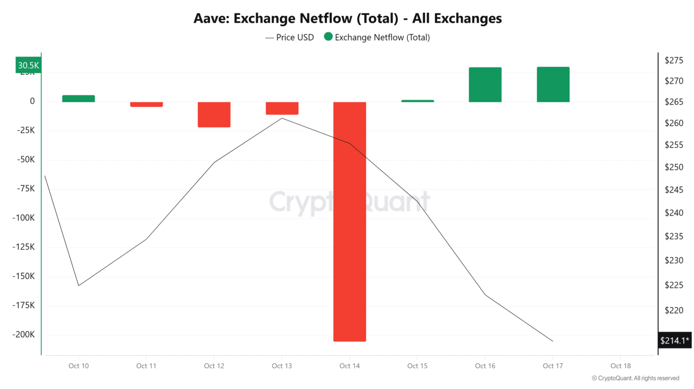 Diễn biến trên các sàn giao dịch cũng củng cố bức tranh tiêu cực này. Theo dữ liệu từ CryptoQuant, dòng nạp ròng (Exchange Netflow) của AAVE đã duy trì ở mức dương ba ngày liên tiếp, với tổng lượng nạp lên sàn khoảng 30.000 AAVE.
