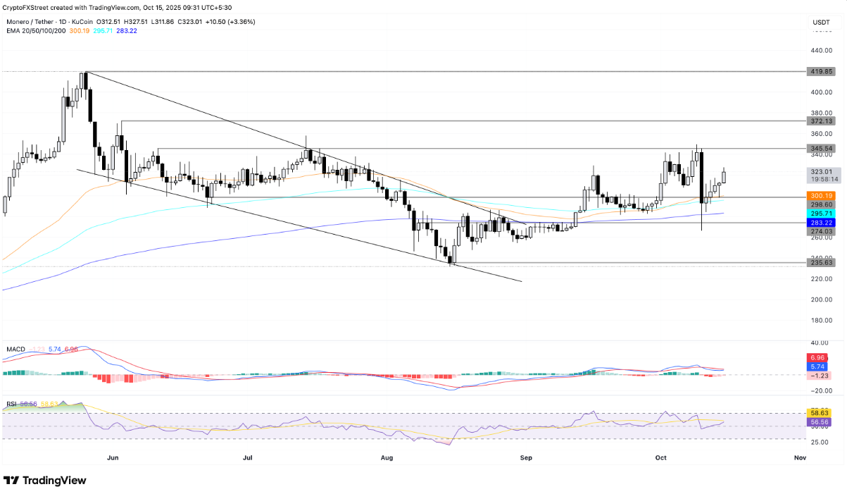Ngược lại, các đường EMA 50, 100 và 200 ngày vẫn đang dốc lên, đóng vai trò vùng hỗ trợ động lần lượt tại 300 USD, 295 USD và 283 USD, củng cố niềm tin rằng xu hướng tăng của Monero vẫn chưa bị phá vỡ.