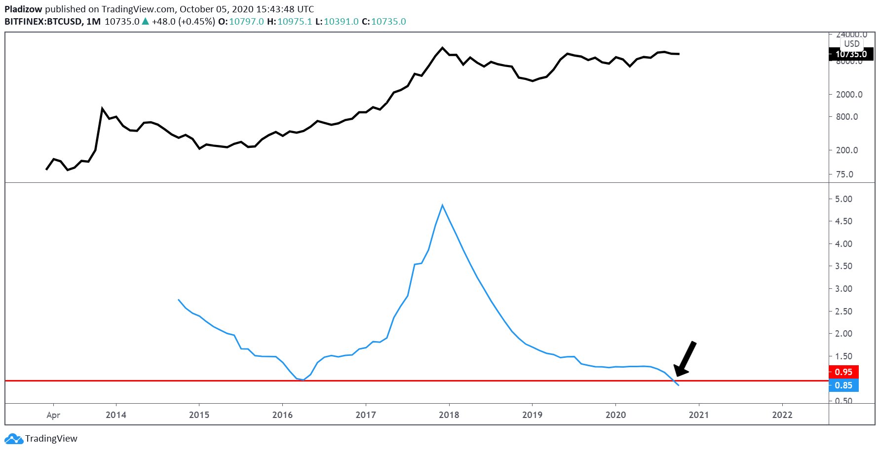 Lần đầu tiên kể từ năm 2016, độ rộng Bollinger Band của Bitcoin giảm xuống dưới 0,95. Dải Bollinger là một chỉ báo kỹ thuật được sử dụng rộng rãi để đánh giá xu hướng biến động của tài sản. Nó có thể cho thấy rằng một đợt tăng đột biến biến động lớn sắp xảy ra.