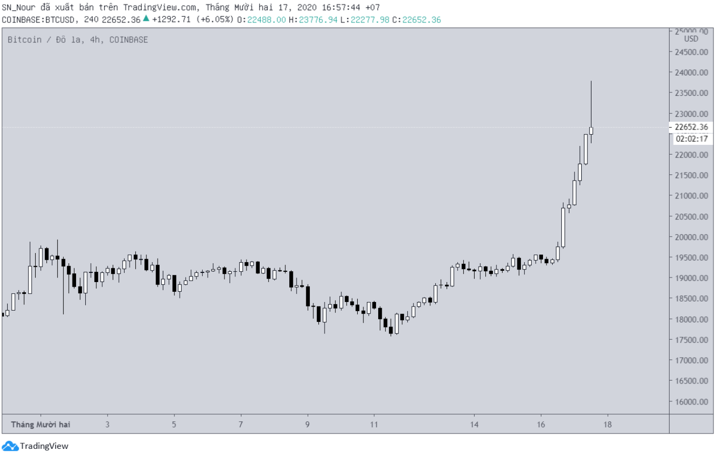 Bitcoin đã tăng lên trên $ 20.000 trước khi cuộc họp của Fed kết thúc, chỉ ra dự đoán của các nhà đầu tư rằng ngân hàng trung ương sẽ mở rộng chương trình mua tài sản của mình trong môi trường lãi suất cho vay gần bằng không. Sau đó Bitcoin đã mở rộng cuộc biểu tình lên hơn $ 23.000 khi kỳ vọng của họ trở thành sự thật.