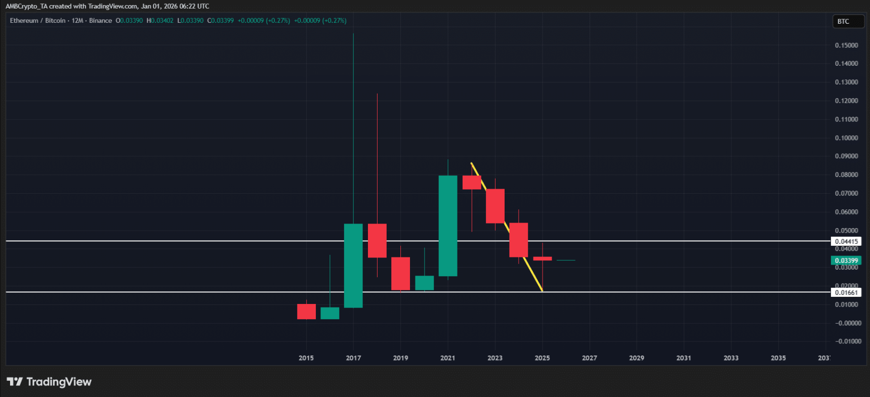 Theo thông lệ, altcoin thường bứt phá trong những giai đoạn Bitcoin (BTC) đi ngang. Nhưng ở chu kỳ vừa qua, sự dịch chuyển ấy đã không diễn ra trọn vẹn. Tỷ lệ ETH/BTC bị “kẹt” trong biên độ hẹp, qua đó hạn chế đáng kể dư địa tăng trưởng mang tính đầu cơ của Ethereum (ETH).