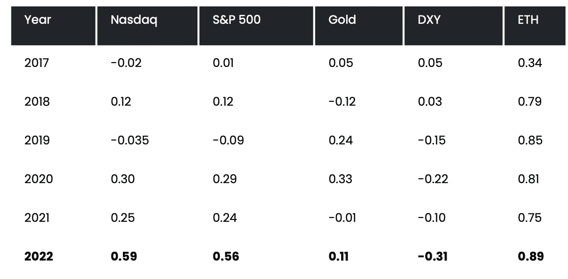 Mối tương quan của BTC với các cổ phiếu khác cũng cao đáng kể vào năm 2022. Báo cáo đã xem xét tương quan hàng năm của BTC với Nasdaq, S&P 500, vàng, DXY và ETH kể từ năm 2017.