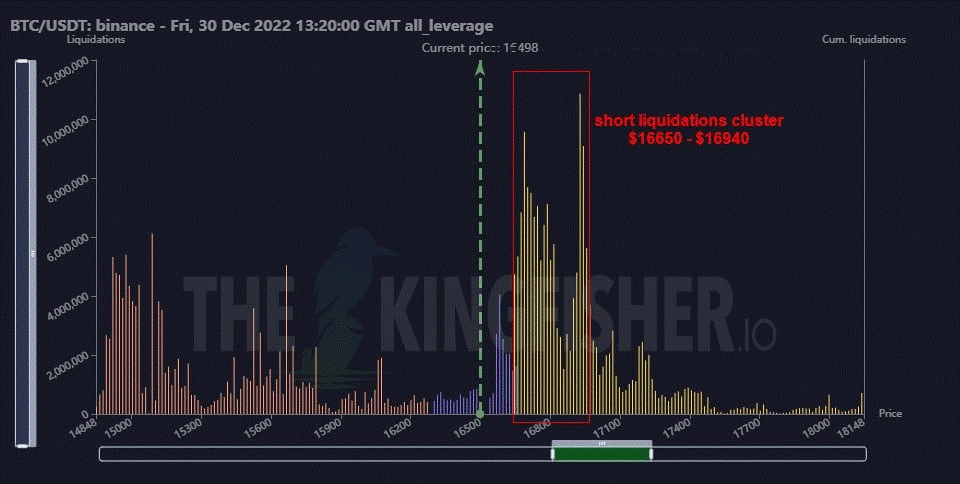 Một cụm thanh lý Short đã hình thành trên Binance giữa các mức giá từ 16.650 đô la đến 16.940 đô la. Giá BTC hiện tại dao động quanh mức 16.605 đô la tại thời điểm viết bài, chỉ còn cách 50 đô la nữa là vào vùng cụm.