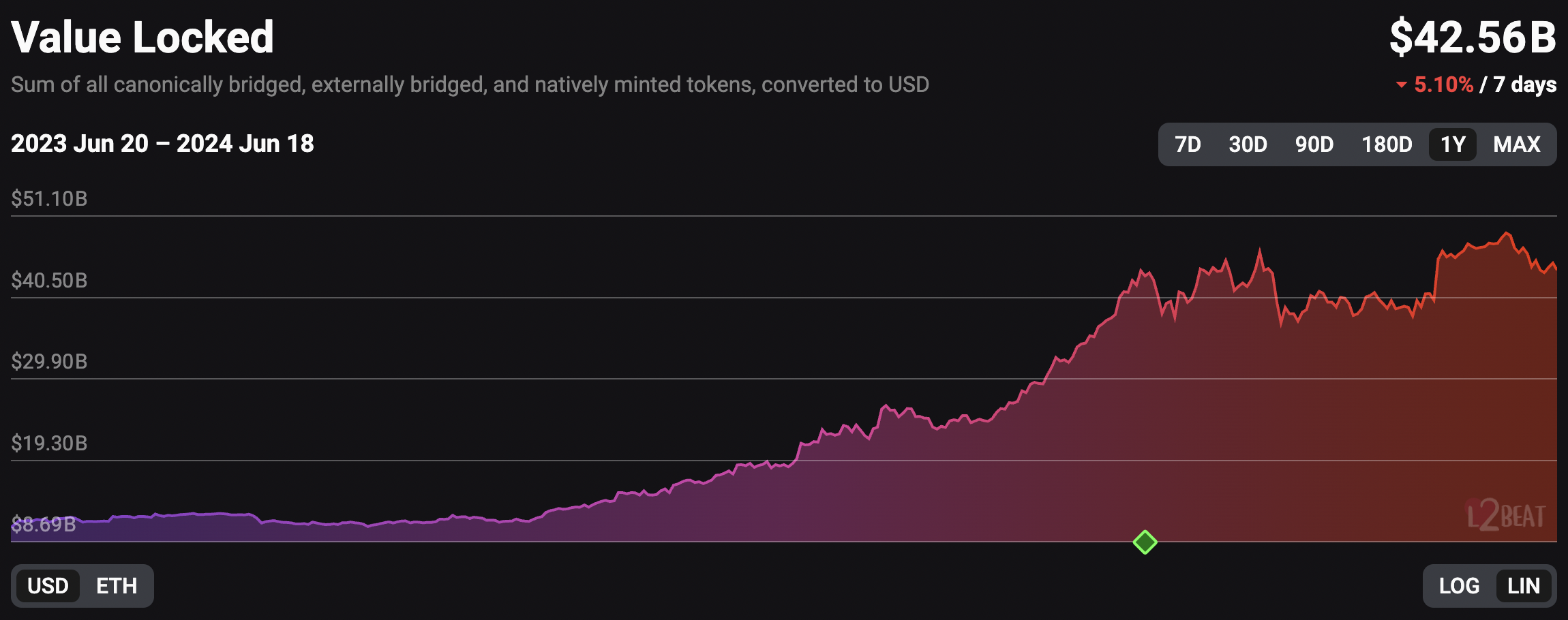 Dữ liệu từ trình theo dõi tiền điện tử L2Beat cho thấy tổng giá trị khóa (TVL) trong các dự án Layer 2 và Layer 3 trong hệ sinh thái vượt quá 43,99 tỷ USD tại thời điểm viết bài.