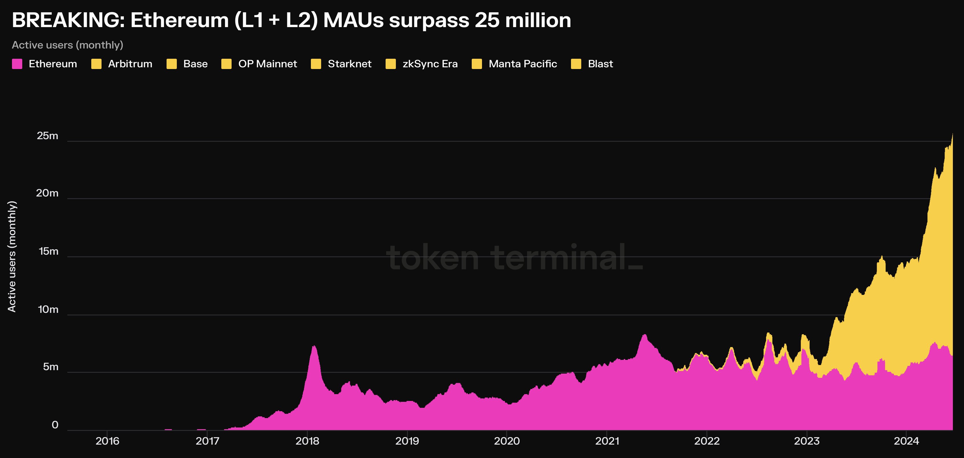 Các chuỗi Layer 1 và Layer 2 của Ethereum đã ghi nhận sự gia tăng hoạt động nhất quán trong năm 2024. Số lượng người dùng hoạt động hàng tháng (MAU) đã vượt qua mốc 25 triệu theo dữ liệu từ Token Terminal.