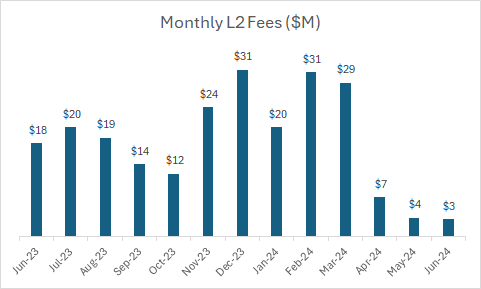 Với sự giảm đáng kể phí Layer 2, có sự gia tăng trong việc chấp nhận các chuỗi này trong giới trader. Đây là một yếu tố góp phần vào sự gia tăng số lượng người dùng hoạt động hàng tháng trên Ethereum. Phí hàng tháng đã giảm từ 18 USD xuống còn 3 USD trong khoảng thời gian từ tháng 6 năm 2023 đến năm 2024, như được thấy trong biểu đồ dưới đây.
