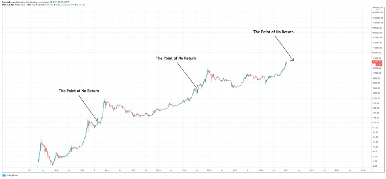 Biểu đồ trên minh họa “điểm không thể quay lại” trông như thế nào. Kể từ thời điểm đó, tiền điện tử hàng đầu theo vốn hóa thị trường sẽ tăng thêm khoảng 600-800% nữa. Mức tăng tương tự từ mức hiện tại, sẽ đưa giá BTC lên khoảng $ 250.000 đến $ 350.000, điều này không hề viển vông khi xem xét các mục tiêu mà các chuyên gia thuộc mọi tầng lớp đang dự đoán.