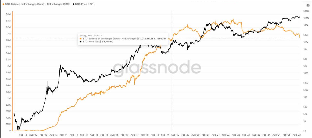 Dữ liệu từ Glassnode cho thấy lượng Bitcoin nắm giữ trên các sàn giao dịch đã giảm xuống mức thấp nhất kể từ năm 2019. Diễn biến này phản ánh xu hướng nhà đầu tư tiếp tục rút Bitcoin về ví riêng, cho thấy tâm lý nắm giữ dài hạn (HODL) ngày càng mạnh mẽ giữa bối cảnh giá BTC liên tục lập đỉnh mới.