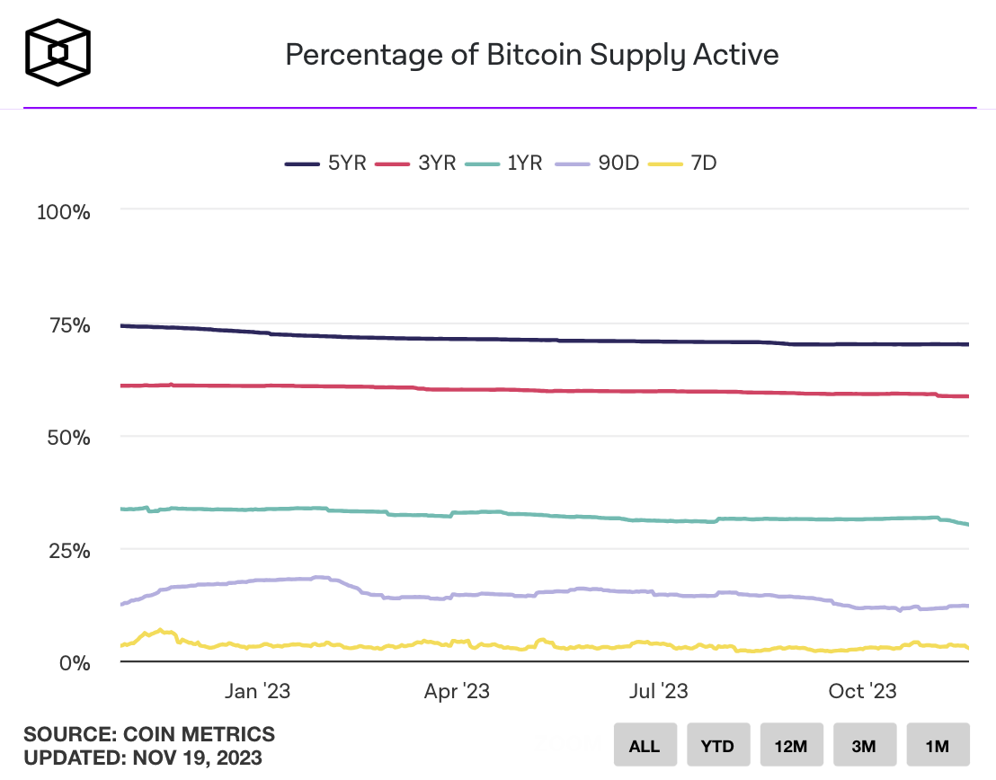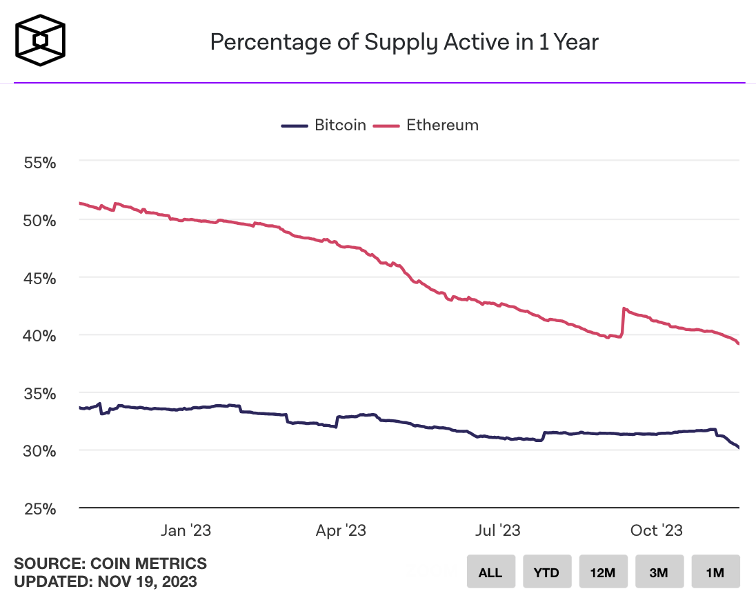 Vào thời kỳ đỉnh cao, hơn 59% nguồn cung Bitcoin hoạt động từ tháng 3 năm 2017 đến năm 2018. Tuy nhiên, trong năm qua, chỉ có 30,12% nguồn cung Bitcoin được đổi chủ. Ether, chứng kiến ​​hơn 86% nguồn cung được dịch chuyển trong khoảng thời gian từ tháng 7 năm 2016 đến năm 2017, cũng đạt mức thấp kỷ lục, chỉ có 39,15% nguồn cung được đổi chủ trong năm qua.