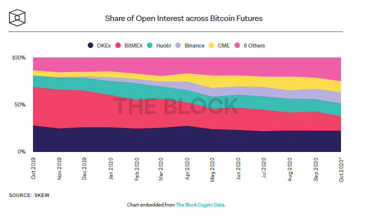Sự tăng trưởng chóng mặt của thị trường phái sinh tiền điện tử cũng có thể đóng một vai trò trong sự tăng trưởng của thị trường stablecoin, cụ thể là của USDT. Hầu hết các sàn giao dịch phái sinh đều trade theo cặp USDT. BitMEX, đã chứng kiến sự sụp đổ thị phần trong những tháng gần đây, là một ngoại lệ đáng chú ý yêu cầu tài sản thế chấp bằng bitcoin. Trong khi đó, thị phần của các sàn giao dịch chấp nhận tài sản thế chấp USDT đã tăng lên so với BitMEX.