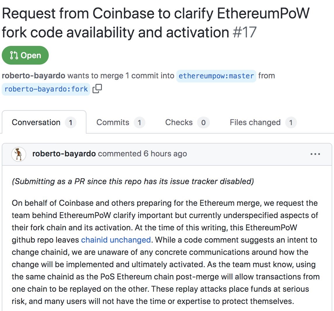 Trước đó, một thành viên của team Coinbase đã nhận xét về kho lưu trữ ETHPoW GitHub và yêu cầu làm rõ cách thiết lập fork chain.