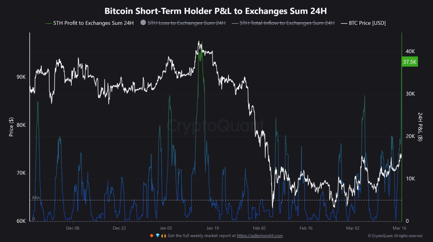 Các nhà đầu tư Bitcoin ngắn hạn đã chuyển hơn 37.500 BTC lên các sàn giao dịch trong 24 giờ qua, ghi nhận mức dòng tiền vào lớn nhất kể từ ngày 15/1. Diễn biến này cho thấy áp lực bán có thể gia tăng, do lượng BTC đưa lên sàn thường nhằm mục đích thanh khoản. Giới phân tích nhận định nhóm nhà đầu tư ngắn hạn thường phản ứng mạnh với biến động giá, từ đó thúc đẩy các nhịp dao động nhanh của thị trường.