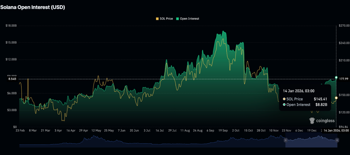 Ở chiều ngược lại, thị trường phái sinh Solana cũng phát đi tín hiệu tích cực về tâm lý nhà đầu tư. Hợp đồng mở (OI) của hợp đồng tương lai đã tăng vọt lên 8,8 tỷ USD vào thứ Tư, đánh dấu mức cao nhất kể từ đầu tháng 11.