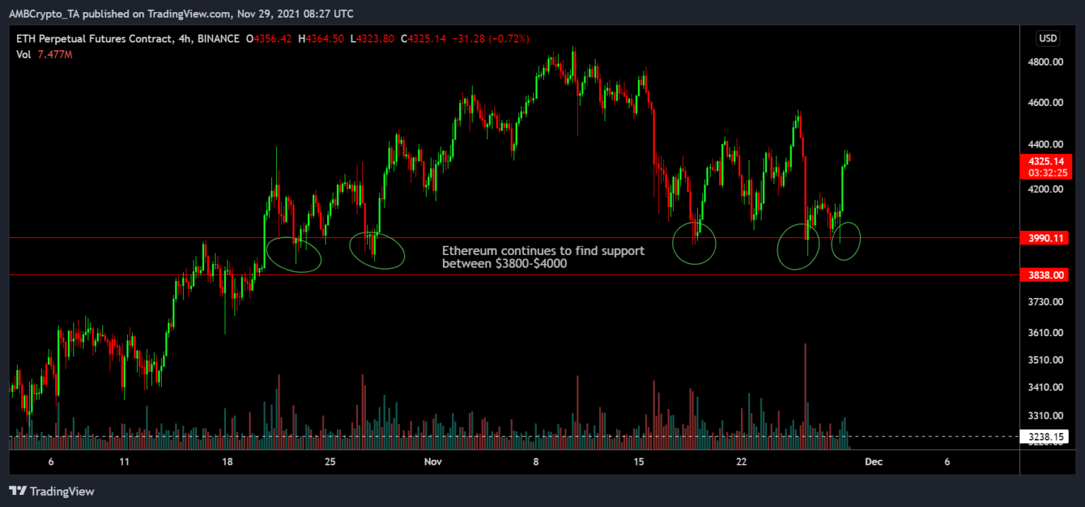 Biểu đồ giá ETH trong ngắn hạn cho thấy sự hỗn loạn, nhưng biểu đồ dài hạn dường như ngụ ý xu hướng tăng tích cực. Theo đó, ETH có thể sẽ có tháng 12 mạnh mẽ trước khi kết thúc năm 2021. Biểu đồ giá hình thành mô hình cốc tay cầm trong vài tháng qua. Trong suốt đầu tháng 11, giá đã phá vỡ mô hình một cách quyết đoán, vượt qua đường kháng cự cơ bản tại 4.000 đô la.